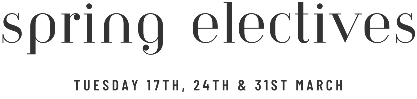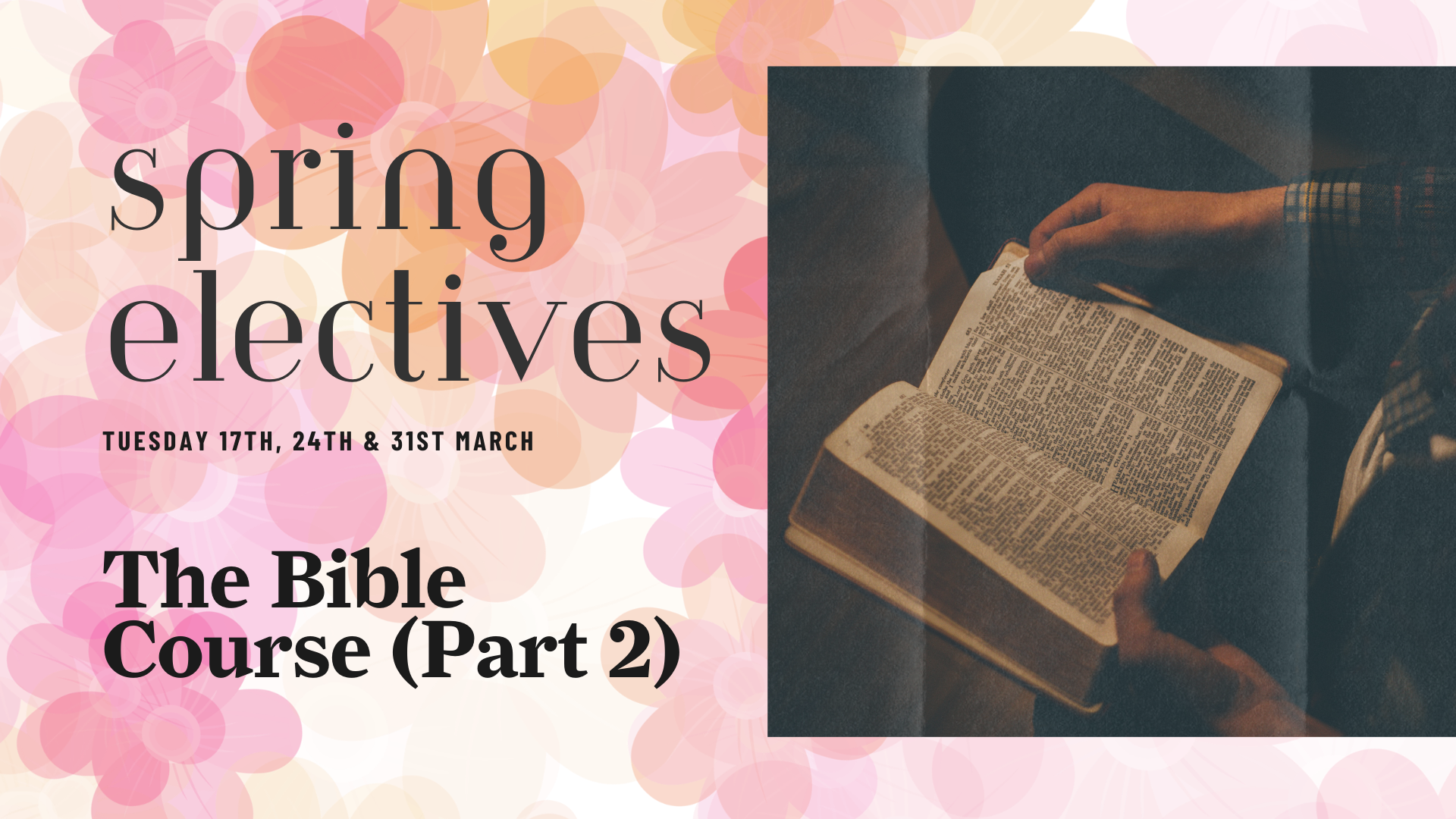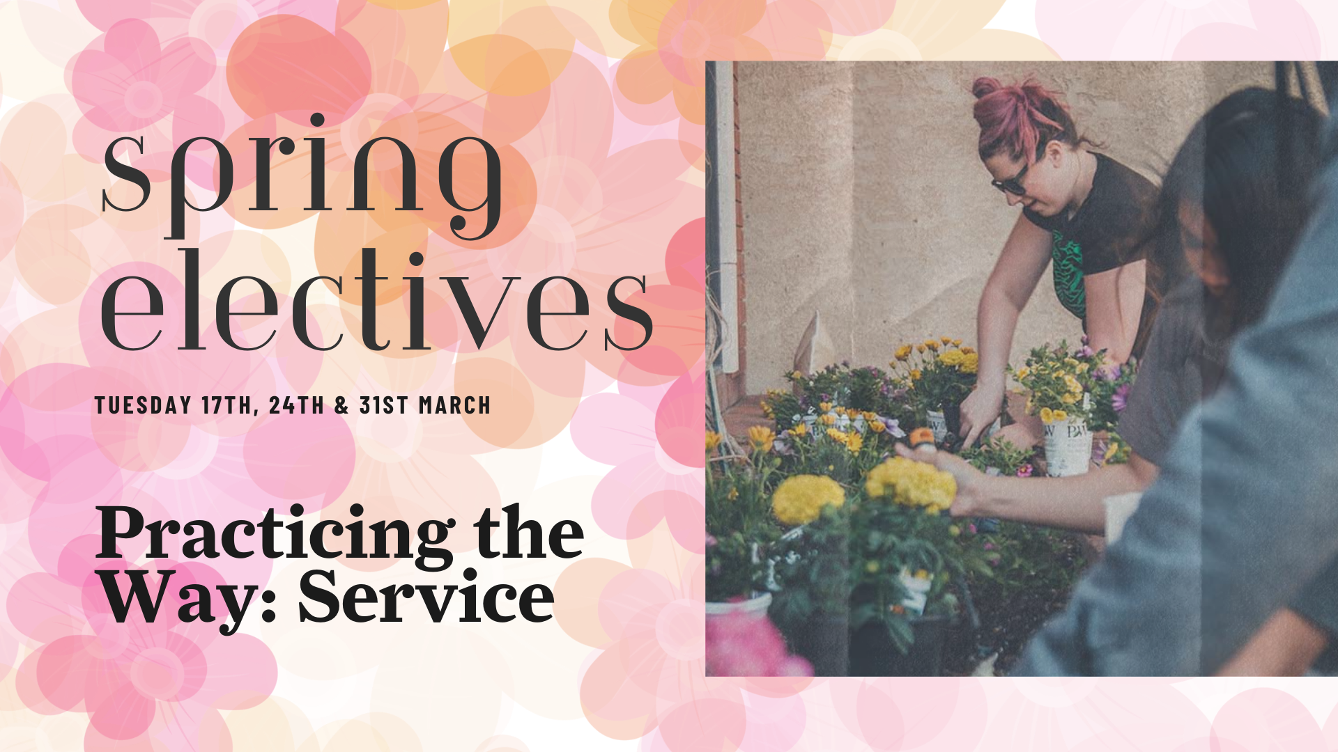 This term we have two electives to choose from: The Bible Course, which continues from Part 1 covered in the winter term, and Practicing the Way, where we'll be exploring the practice of Service.